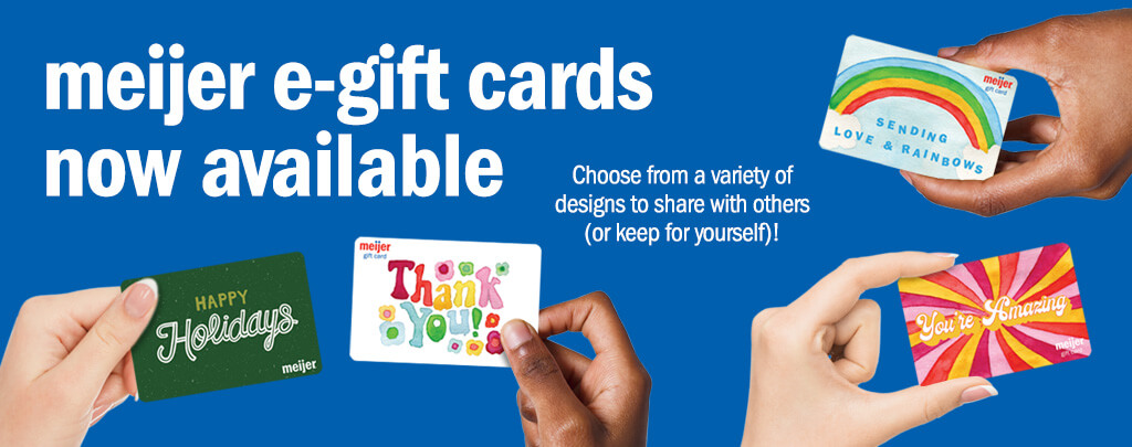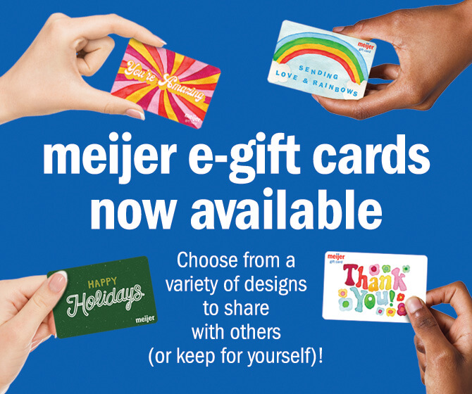 Buy a Meijer Gift Card - Food | Giftly Meijer Gift Card Buy a Meijer Gift & Greeting Card Buy a gift up to $1,000 with the suggestion to spend it at Meijer. Delivered in a customized greeting card by email, mail, or printout. Anything at Meijer for $100 Gift Design Any Occasion Holidays Gift Amount $25 $50 $75 $100 $250 $500 $1000 Other Continue 100% Satisfaction Guaranteed Meijer