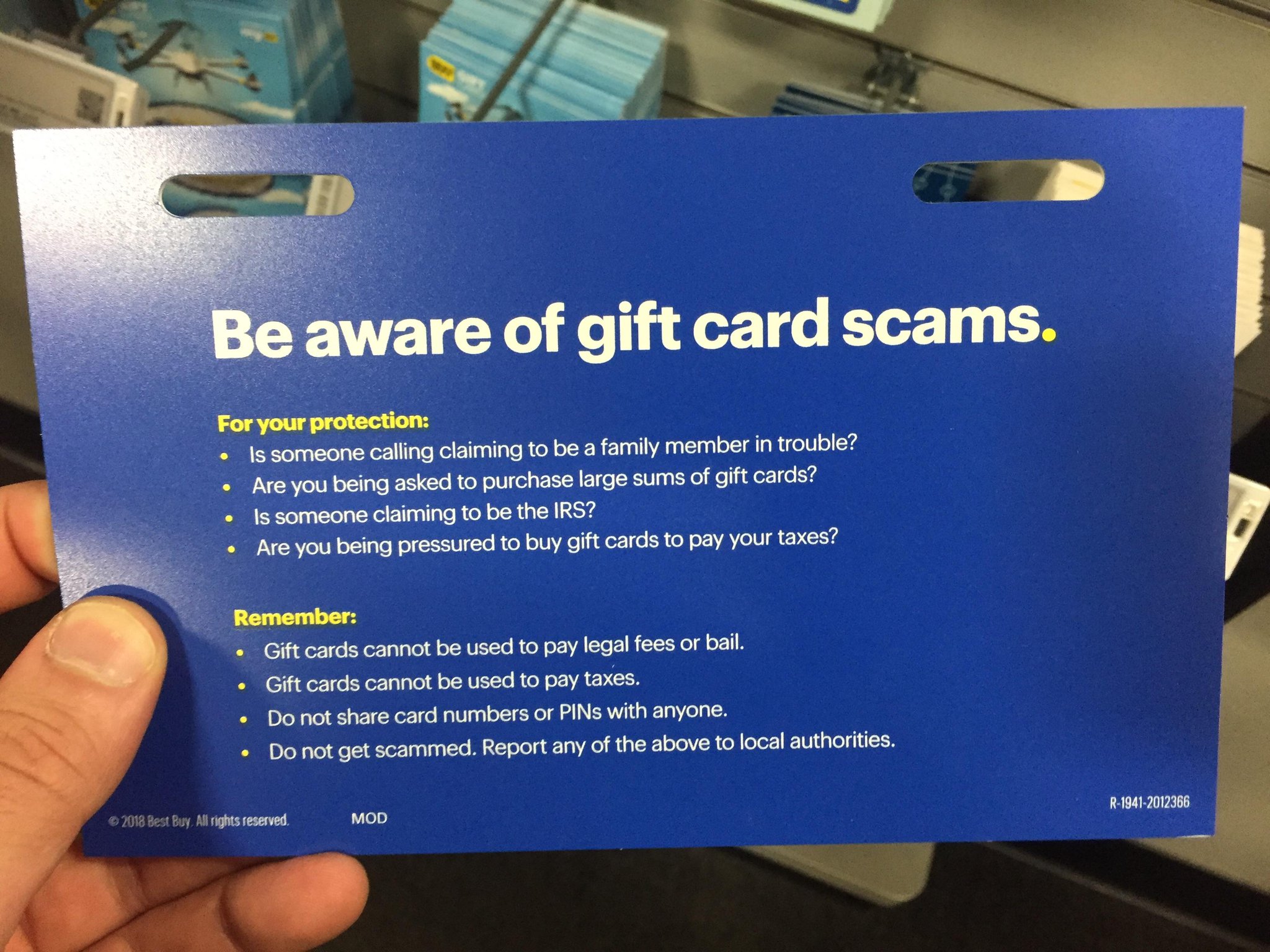 How Scammers Use Gift Cards to Steal Your Money - AARP AARP and Best Buy warn consumers to beware of gift card scams Last year, AARP collaborated with Best Buy and the National Association of Attorneys General to create a public service announcement warning people about gift-card schemes. One of the key messages: Gift cards are not used — and cannot be used — to pay bail, taxes or court fines.